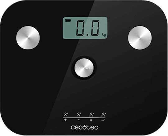 Η ζυγαριά μπάνιου - λιπομετρητής, από τη Cecotec, έχει σχεδιαστεί με γυάλινη πλατφόρμα υψηλής αντοχής και διαθέτει ευρύ φάσμα μέτρησης, από 8 Kg έως 180 Kg με βαθμονόμηση 100 g για αυξημένη αξιοπιστία και 4 αισθητήρες υψηλής ακρίβειας. Η ζυγαριά μετρά με ακρίβεια 6 παραμέτρους του σώματος σε 4 διαφορετικούς χρήστες (μέθοδος μέτρησης Bioelectrical): το βάρος, το σωματικό λίπος, τον δείκτη μάζας σώματος, των μυών, των οστών και του νερού. Η ζυγαριά έχει μεγάλη ψηφιακή οθόνη LCD για μια εύκολη ανάγνωση των μετρήσεων. Οι αριθμοί φαίνονται ξεκάθαρα, χωρίς να χρειάζεται να σκύψετε για να δείτε τα αποτελέσματα των μετρήσεων. Περιλαμβάνει λειτουργία αυτόματης απενεργοποίησης για άνετη χρήση και άμεση ενεργοποίηση πατώντας το κουμπί EcoPower, το οποίο δημιουργεί κινητική ενέργεια που μετατρέπεται αυτόματα σε ηλεκτρική ενέργεια. Επίσης είναι εξοπλισμένη με 4 πόδια από σιλικόνη, παρέχοντας μεγάλη ασφάλεια κατά τη χρήση, αποτρέποντας την ολίσθηση.